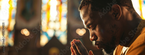 Man, prayer and faith for religion, church or cathedral for hope or spirituality. African person, hands and worship for gratitude, forgiveness or holy gospel for God or Jesus Christ with Christianity