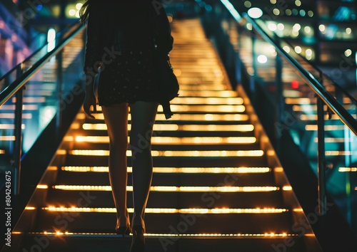 Young Woman Walking Up Illuminated Stairs in City at Night, Urban Lifestyle Concept