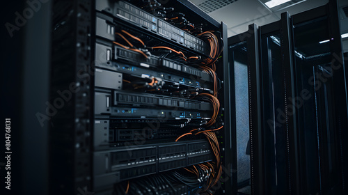 Server Racks and Cabinets full of Hard Drives inside Large Data Center. Advanced Cloud Computing Concept.