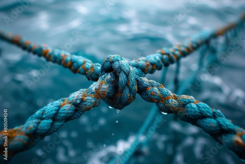 A vivid image capturing a blue rope knot with water droplets, evoking strength, connection and resilience