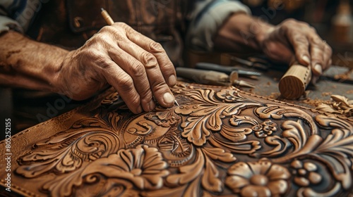 Close-up of a craftsman hand-tooling a detailed design into a leather wallet, emphasizing the meticulous workmanship and traditional techniques of leather crafting