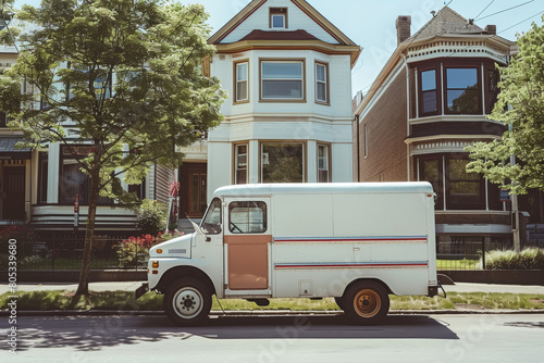 Colorful ice cream truck parked in front of Victorian houses on a sunny day. Urban street photography with vibrant pastel tones. Food truck concept for design, poster, and print.