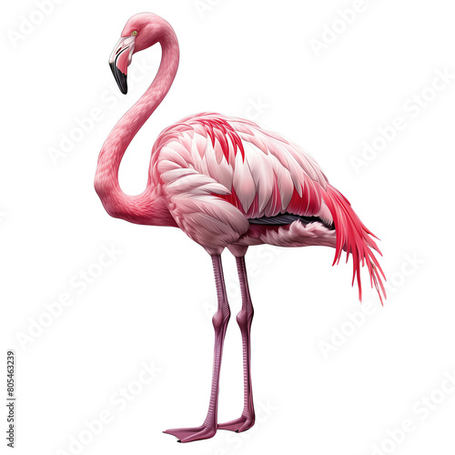 Różowy flaming stojący na dwóch nogach, wznosząc swoje ciało w górę. Ptak prezentuje elegancką postawę i wygląda dumnie