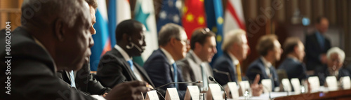 Government officials discussing financial policy at an international summit, aiming to enhance economic collaboration across borders
