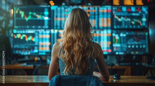 An image shows a woman financial specialist studying blockchain technology in a rear-view mirror. She sits in front of a computer and studies graphs showing statistics about the stock market. She