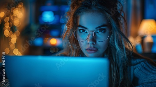 The finance worker is wearing glasses, using a laptop, and making a report to the finance firm