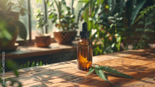 promote natural hemp extract with a cbd oil bottle and dropper on a wooden table, showcasing organic and pure ingredients