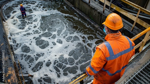 Sludge Treatment, Workers monitoring dewatering equipment processing the sludge into a manageable solid.