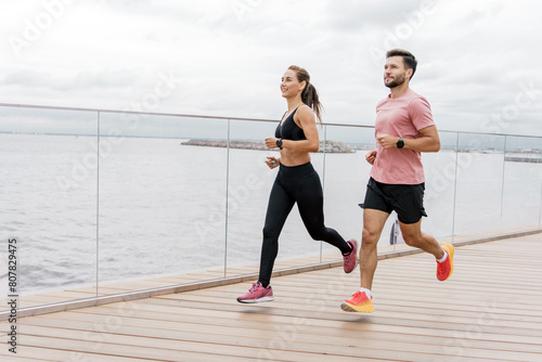 A motivated couple enjoys a brisk jog along a seaside boardwalk, both dressed in workout gear and running shoes, with the ocean stretching out behind them.