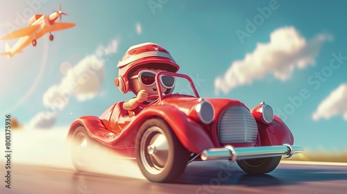 Czerwony samochód porusza się w dół drogi obok latającego samolotu. Widok z perspektywy pasa ruchu z bliżej nieznanych dzieci obserwujących z boku