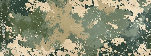 A camouflage pattern with an olive green and beige color scheme, incorporating various shapes of military equipment such as guns, soldiers' pieces.
