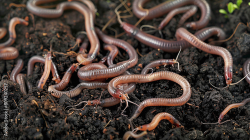 Group of earthworms in the soil and compost, as a background. Gardening concept.