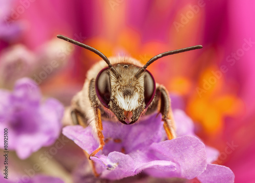 #907399588Closeup on a female Mellow miner, Andrena mitis resting on a green leaf