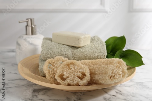 Loofah sponges, soap, towels and green leaves on white marble table