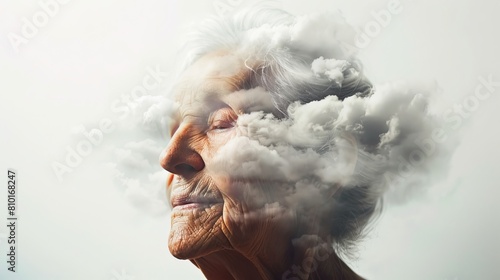 Head of an old woman half covered by a white cloud, concept: Dementia, forgetfulness, white background, 16:9