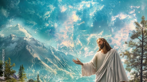 Na obrazie widzimy postać Jezusa stojącego w otoczeniu pustynnej krainy o nieziemskiej urodzie