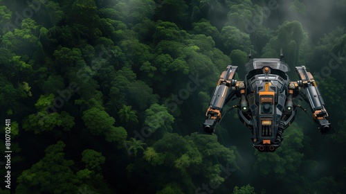 Futurystyczny pojazd unoszący się w powietrzu nad bujnym, zielonym lasem. Pojazd wygląda na zaawansowany technologicznie i jest we wspaniałym kontraście do naturalnego otoczenia