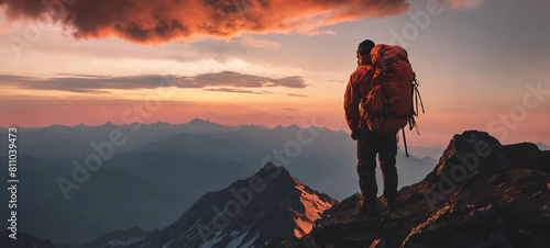 夕陽のパノラマ背景 山頂で景色を眺める登山家