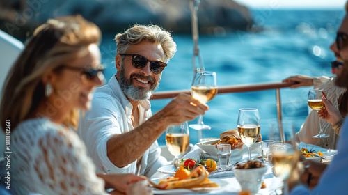 happy smiling middle-aged adults toasting and enjoying a meal in the cruise ship terrace outdoor restaurant, wealthy family on vacations, mediterranean sea