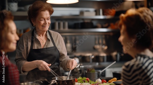 Senior Woman with Chestnut Hair Teaching Cooking Class in Modern Kitchen