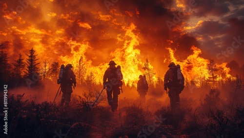Capture the intense teamwork of firefighters battling the forest blaze under a dramatic sky.