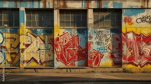 Na bocznej ścianie budynku znajduje się mnóstwo graffiti w różnych kolorach i stylach. Są to rysunki, symbole i napisy namalowane na murze