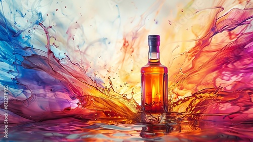 Dynamic scene of a vodka bottle caught in a burst of colorful light, creating a vibrant aura around the bottle, on white