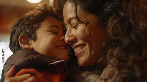 Affectionate moment between smiling latin american mother and latino son at home, showcasing a warm, loving family dynamic