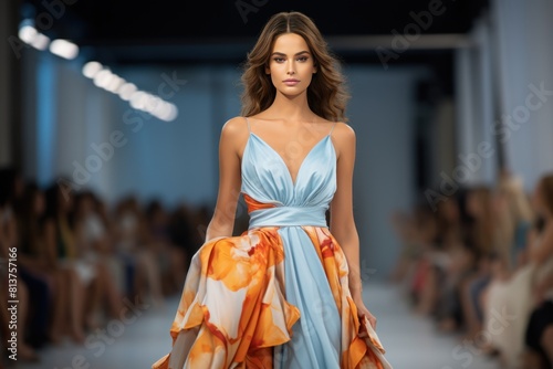 A model walks down the catwalk in a beautiful dress