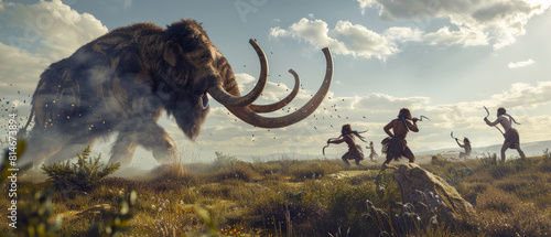 Prehistoric hunters challenging a mammoth in a grassy landscape.