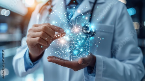 A Medical expert pointing at diagram of digestive system Explain gastritis.