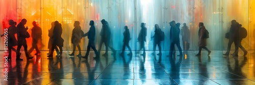 silhouettes of people walking at night, colored lights, in the background a glass wall overlooking a street.