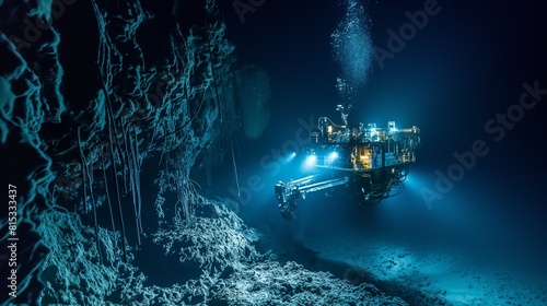 This detailed underwater image illustrates the innovative technology of deep sea mining, featuring a remotely operated vehicle (ROV) extracting minerals from the ocean floor. Experience the sophistica