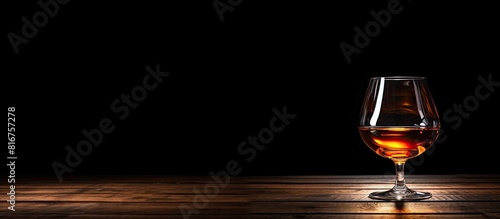 A copy space image of cognac or brandy placed on a vintage wooden table against a black backdrop