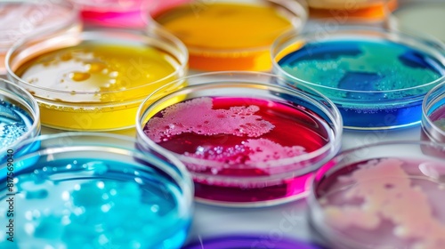Colorful petri dishes containing various bacteria cultures in a laboratory setting, showcasing vibrant biochemical reactions.
