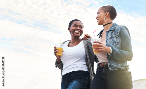 Friends, together and walking with blue sky and drinks for wellness, outdoor with happiness for freedom. Women, low angle and smile in neighborhood with discussion on equality, rights and opportunity