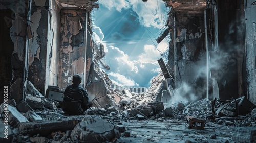 A man sitting on the ground in a destroyed building. Suitable for illustrating post-war or disaster themes