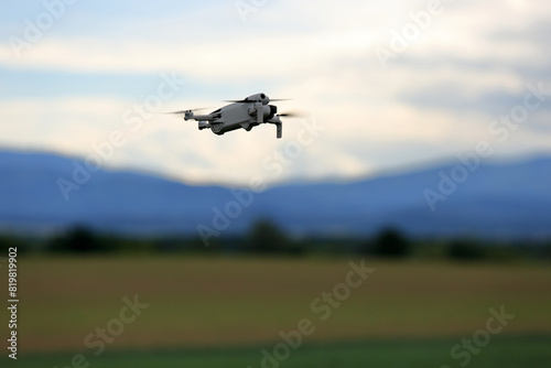 Dron w powietrzu, w locie na tle zieleni, wzgórza, gór.