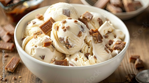 vanilla ice cream with chopped heath bars in a white bowl
