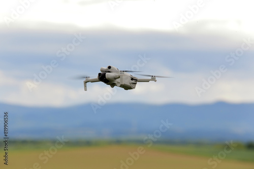 Dron w powietrzu, w locie na tle zieleni, wzgórza, gór.