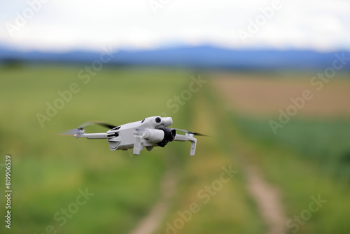 Dron w powietrzu, w locie na tle zieleni, wzgórza, gór.