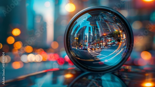 Capture a mesmerizing close-up of a crystal-clear camera lens reflecting a vibrant cityscape, emphasizing sharpness and depth Utilize CG 3D for a hyper-realistic final image