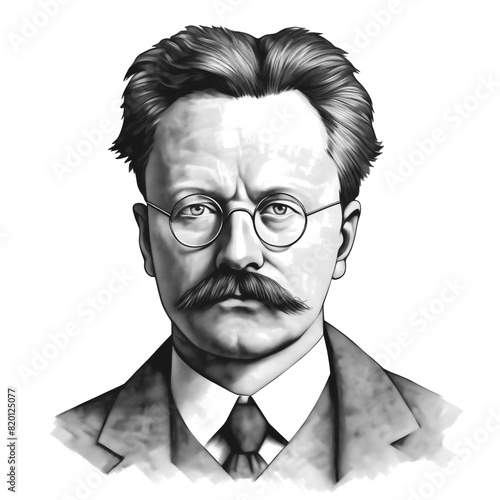 Black and white vintage engraving, close-up headshot portrait of Leon Trotsky (Lev Davidovich Bronstein), the famous historical Russian revolutionary, communist theorist, white background, greyscale