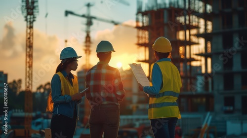 Team of architects using tablets and standing to read blueprints at construction site, designers and engineers building, civil and steel structures.
