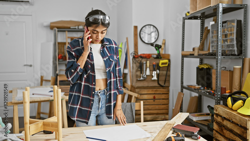 A young indian woman with long hair talks on the phone in a well-equipped carpentry workshop.