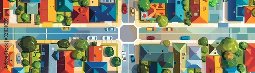 An aerial view of a diverse neighborhood block party, top view, representing community harmony, futuristic tone, Tetradic color scheme