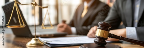 An image depicting elements of the legal system with professionals, gavel, and scales of justice