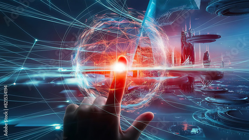 Digital technology, internet network connection concept. Finger touching on virtual screen with futuristic technology background, data exchange