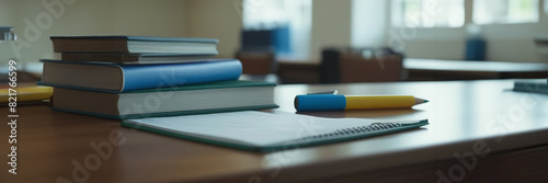 A well-organized study desk featuring a stack of books, a notebook, and two pens. The desk is situated in a bright room, suggesting a productive and focused study environment