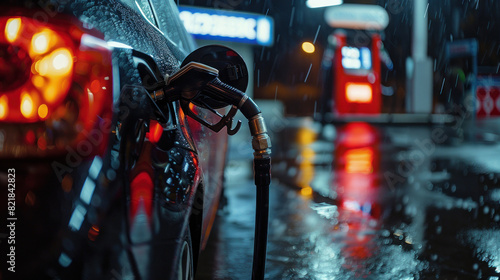 refueling black car at a gas station, nozzle in fuel tank at night in the light of lanterns, poster, copy space